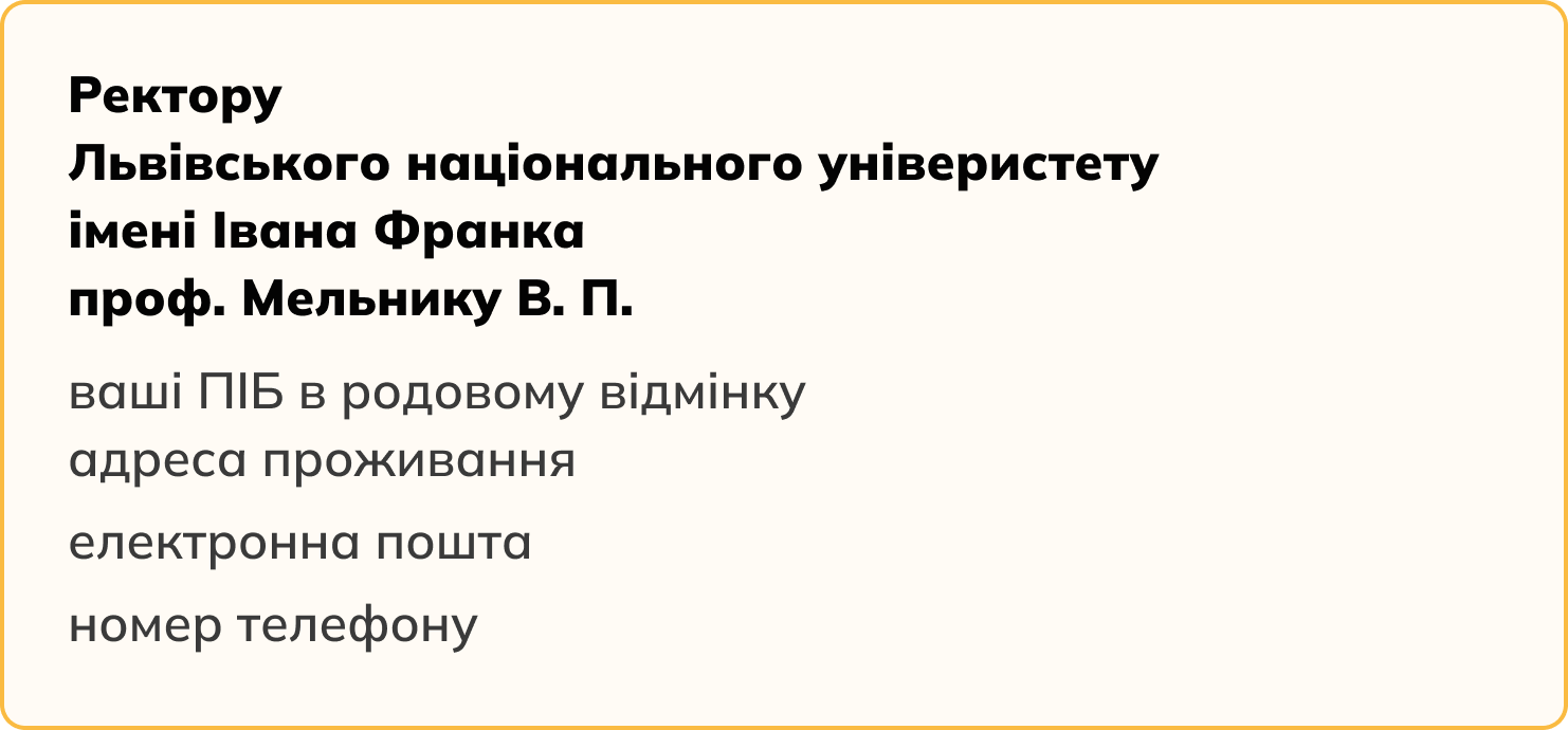 - Прізвище, ім’я, по батькові (в родовому відмінку)